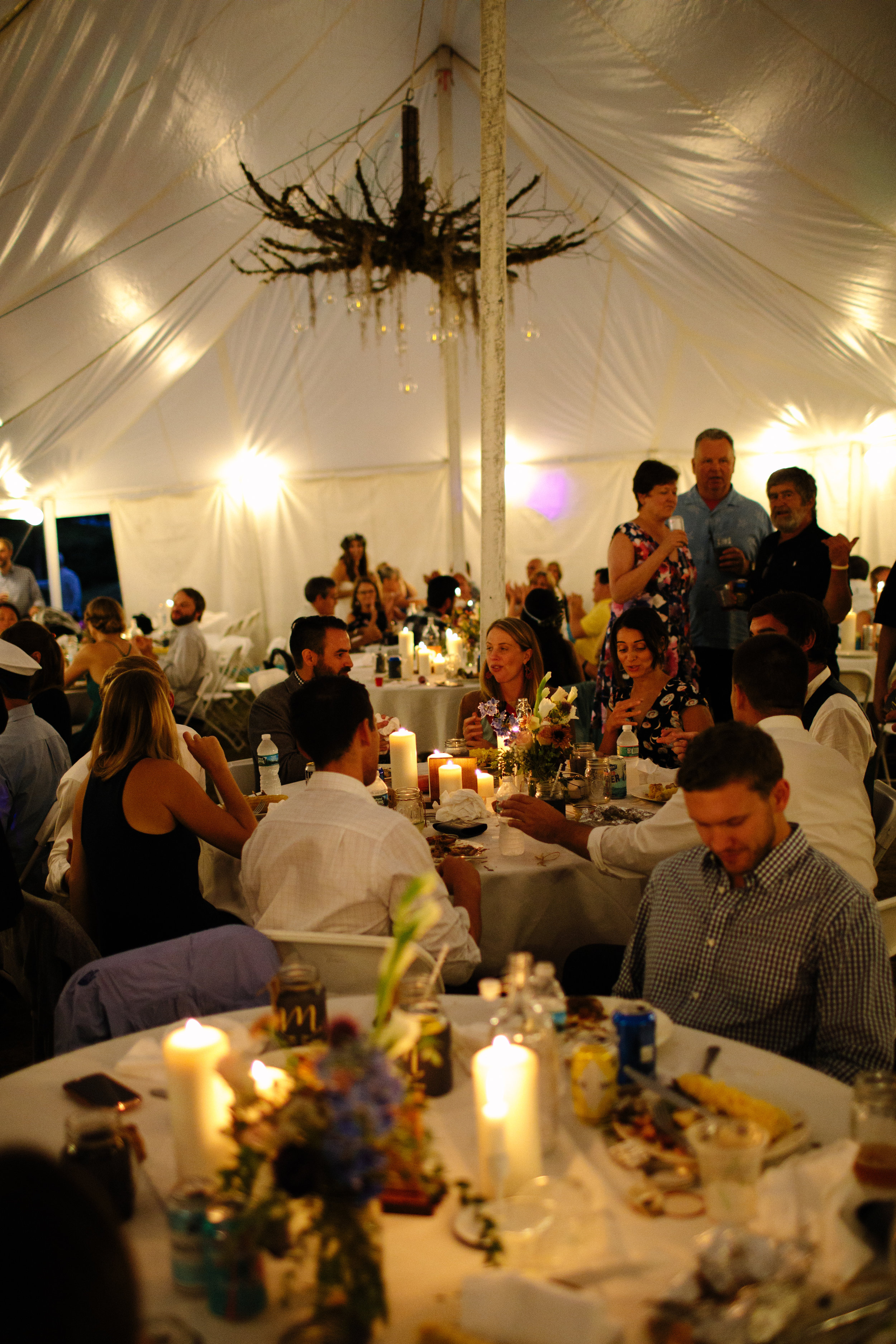 Guests threw on rain coasts and ponchos and headed to their seats. Doug's good friend officiated and included personal stories that added laughter to their radiant exchange of love. As the ceremony ended the bagpiper began to play, and the joy floated in the air. The couple walked up the hill and were greeted with hugs, handshakes, and a bottle of 14 year old Oban whiskey.The whole group headed back to the main camp for the reception, and Lindsey and Doug took their first ride as a married couple on an ATV. Upon their arrival, they were welcome with some of the most enthusiastic hollers I have ever heard.